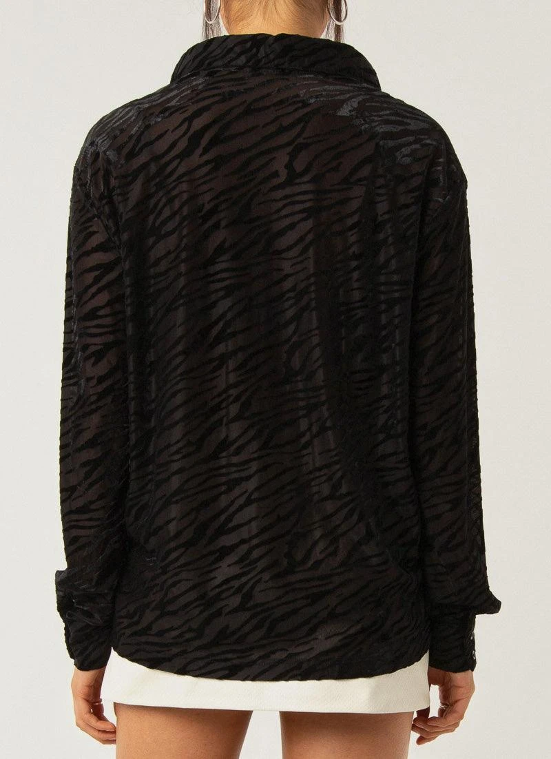All for the good times in the All About You Shirt. An oversized button down shirt in sheer mesh material with a textured zebra print. The perfect layering piece for any ‘fit!