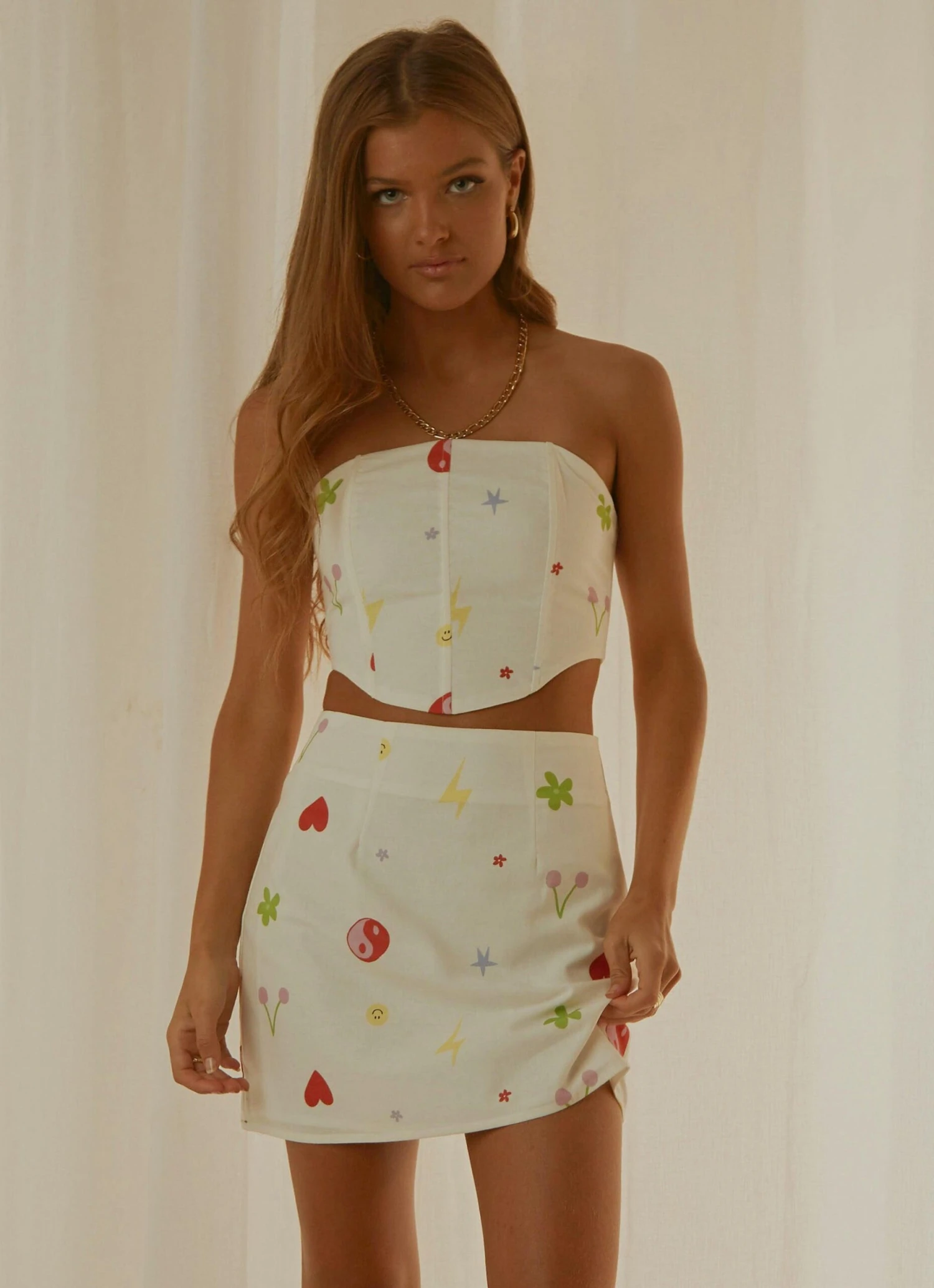 Our Morning Market Mini Skirt pairs back perfectly with the Fashion Flashback Bustier Top, the perfect look for sunset cocktails overlooking the ocean.
