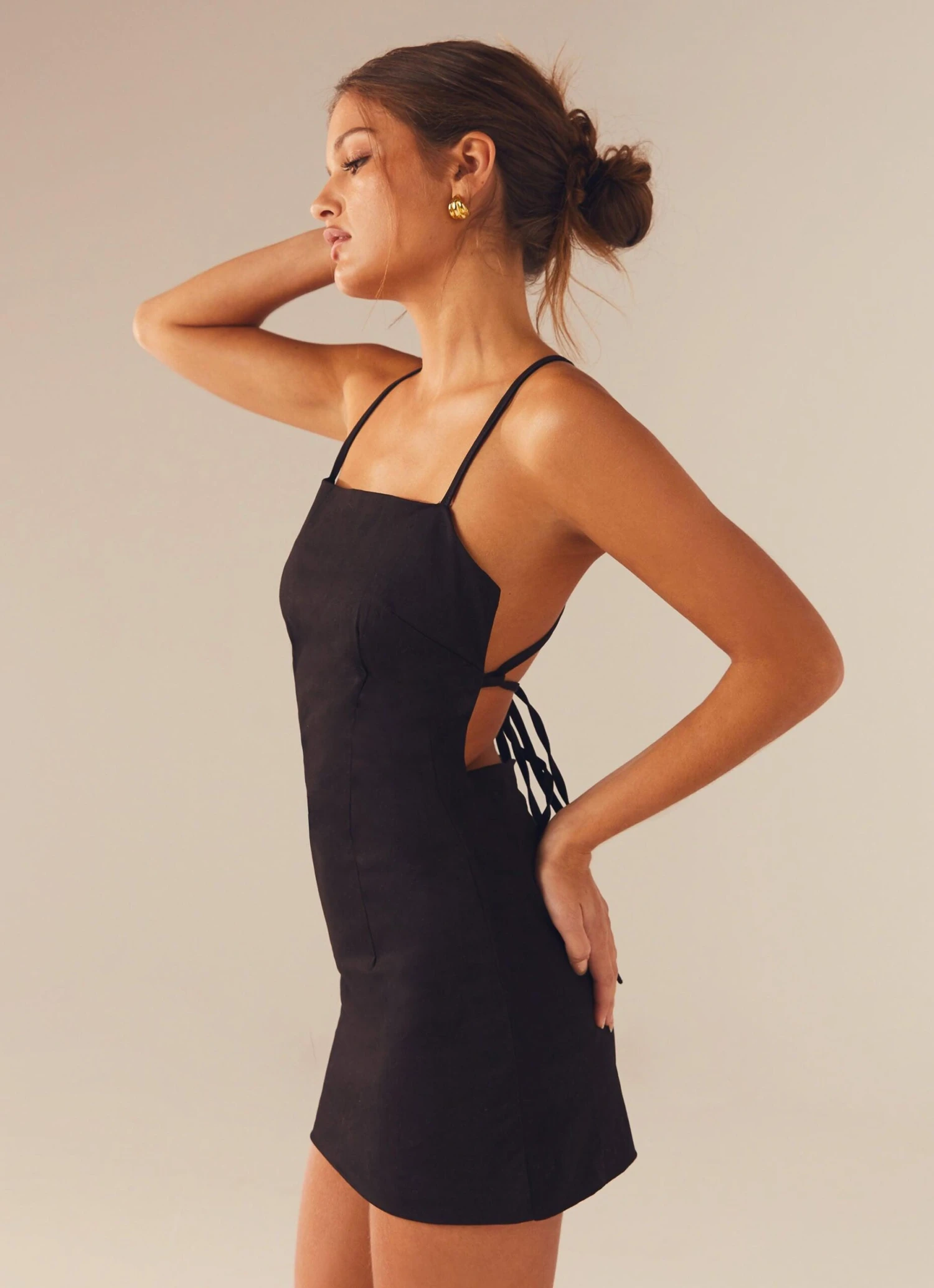 The cutest lil apron moment. We love this take on the LBD, featuring an open back and a line fit. We love this paired with chunky sneakers and a blazer.