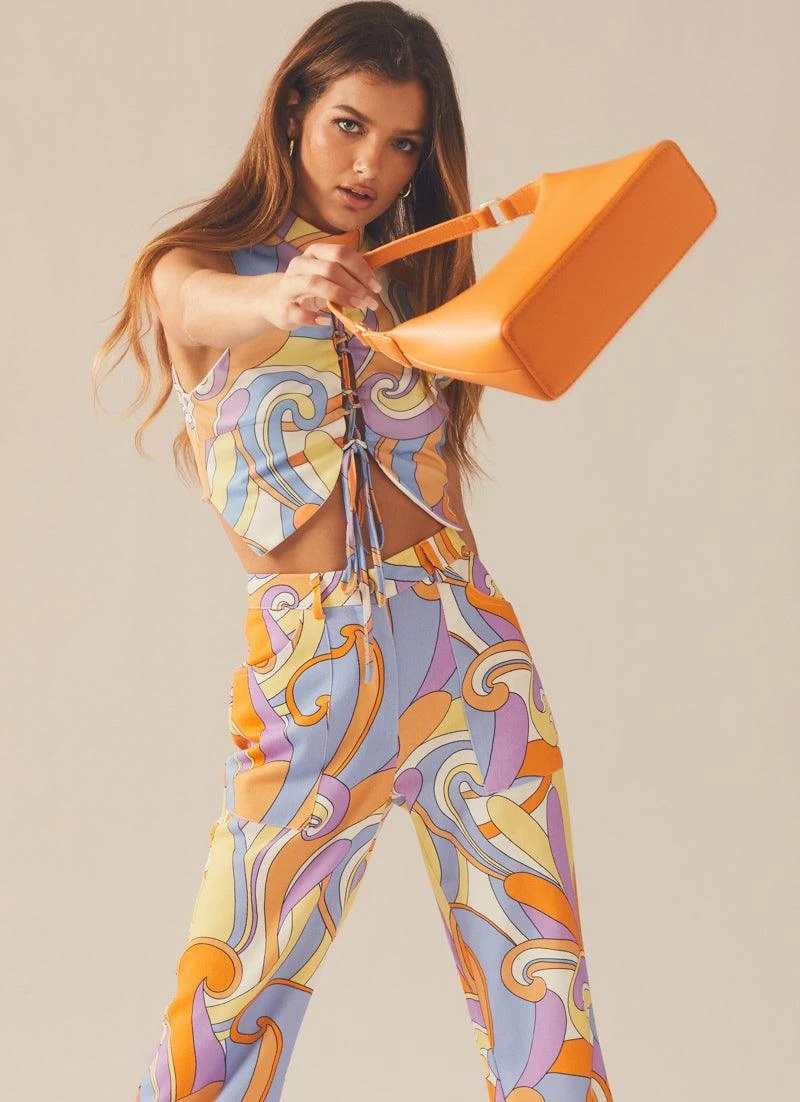 What all your retro dreams are made of! The Paradising Mesh Top is a crop top with high neck that fastens at the back and features strappy tie detailing down the body. Crafted in our exclusive and groovy Retro Swirl print. We love it paired with the Evie Pants or Paradising Mesh Skirt.