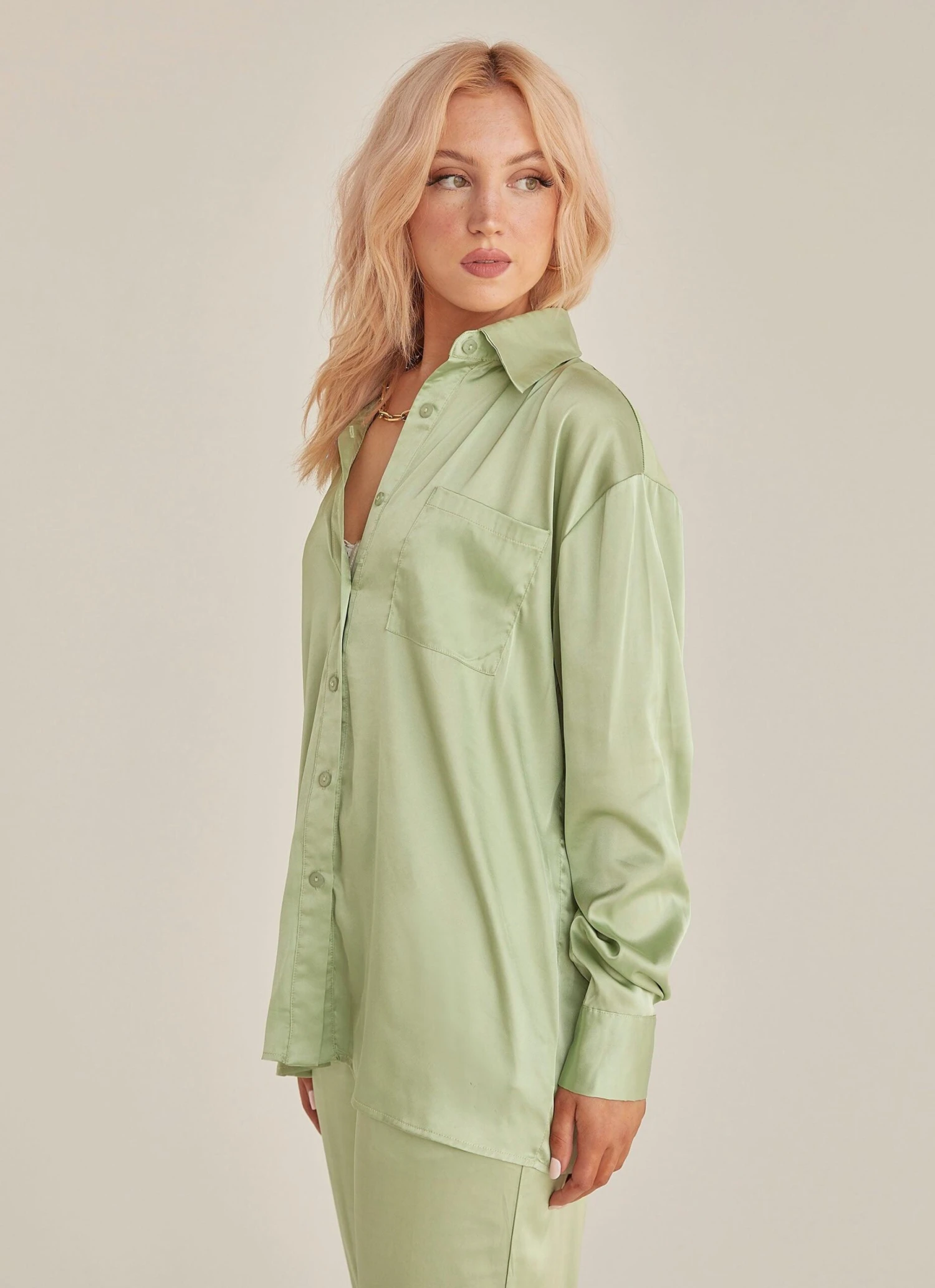 Sexy simplicity in the silky Shadow Tones Shirt. A soft collared button down shirt in striking sage green colour. Complete your off duty look with the the co-ord Dreaming Of You Pants.