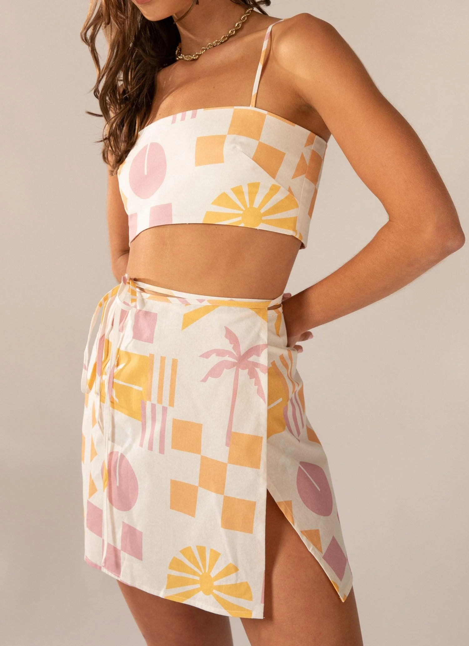 Made for summer days and balmy nights! The Sitting In The Sun Crop Top is crafted in a light linen blend featuring an abstract print in pink, orange and yellow hues. Cut with a straight neckline and spaghetti straps, this is sure to be on repeat in your summer wardrobe.