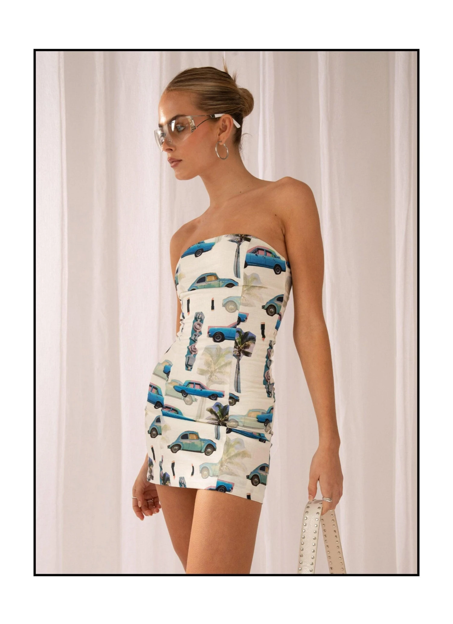 Handpicked for your next vacay babes! The Skyscrapers Linen Mini Dress has been crafted in crisp white linen with vintage inspired retro print. Perfect for a summer getaway with is strapless design, fitted bodice and mini length.
