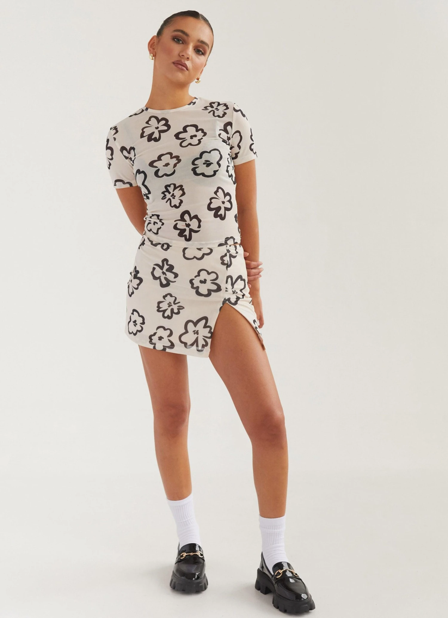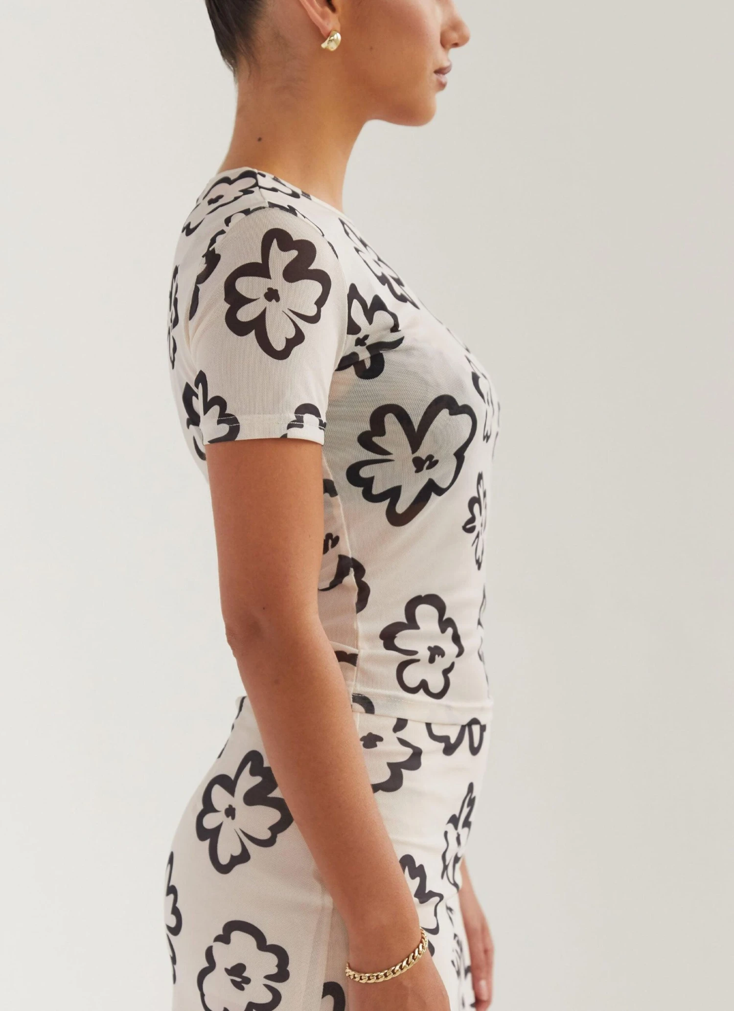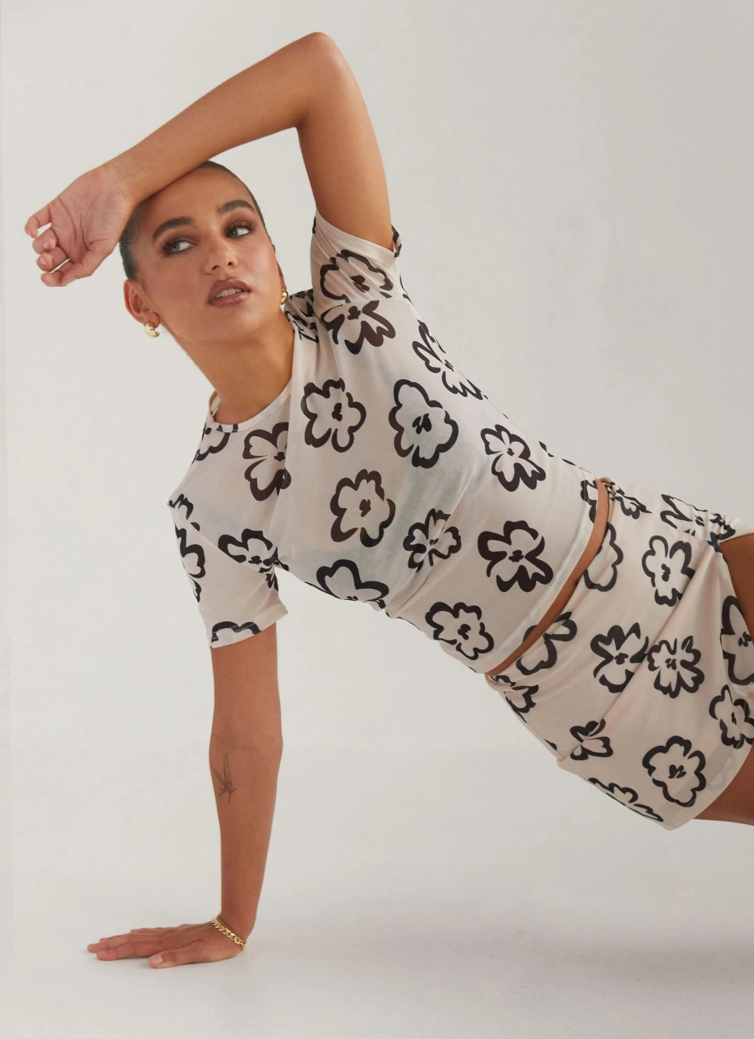 Keep it cute in the Structured Shapes Mesh Tee. A cropped, fitted tee crafted in soft mesh and featuring our exclusive Silk x Peppermayo floral motif.