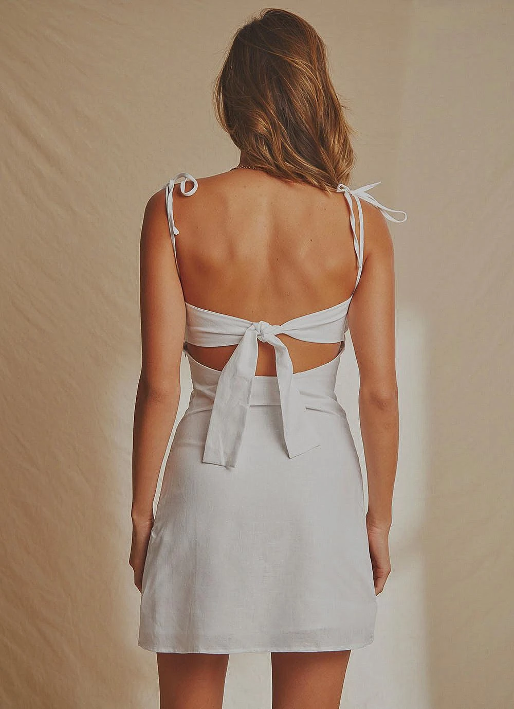 The ultimate summer mini dress is here. Our Style File Mini Dress is so chic it hurts. Made from a super soft linen-cotton blend, and featuring a delicate gathered bust and tie style back- this little mini is anything but basic. We love this paired with heeled mules, a chic top knot and vintage inspired accessories.