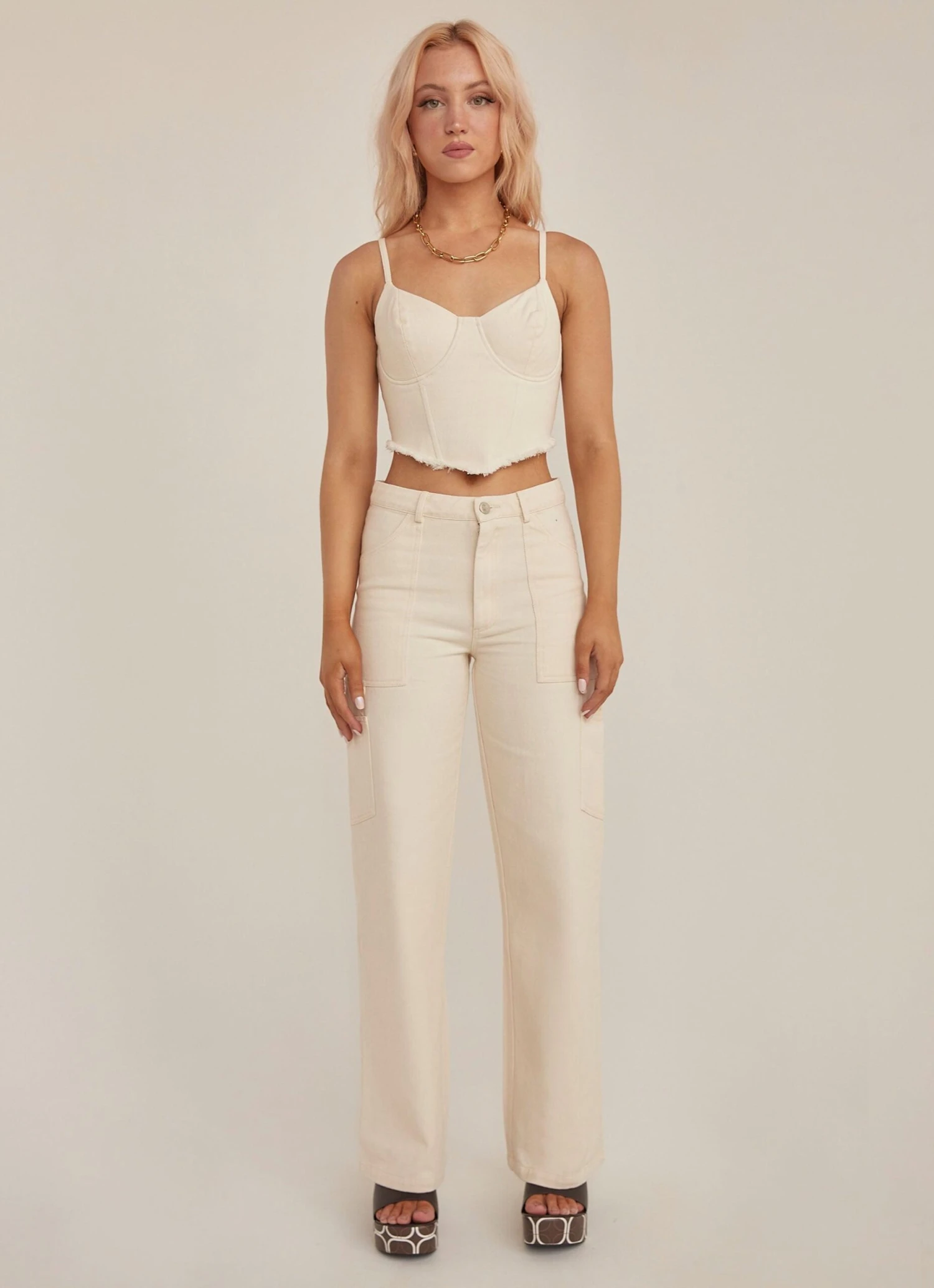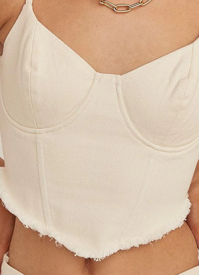 Girl, you are the vibe! Structured and chic, the Sundown Vibes Drill Bustier in neutral ivory tone features cropped length with raw hem and adjustable straps for the perfect fit and comfort.