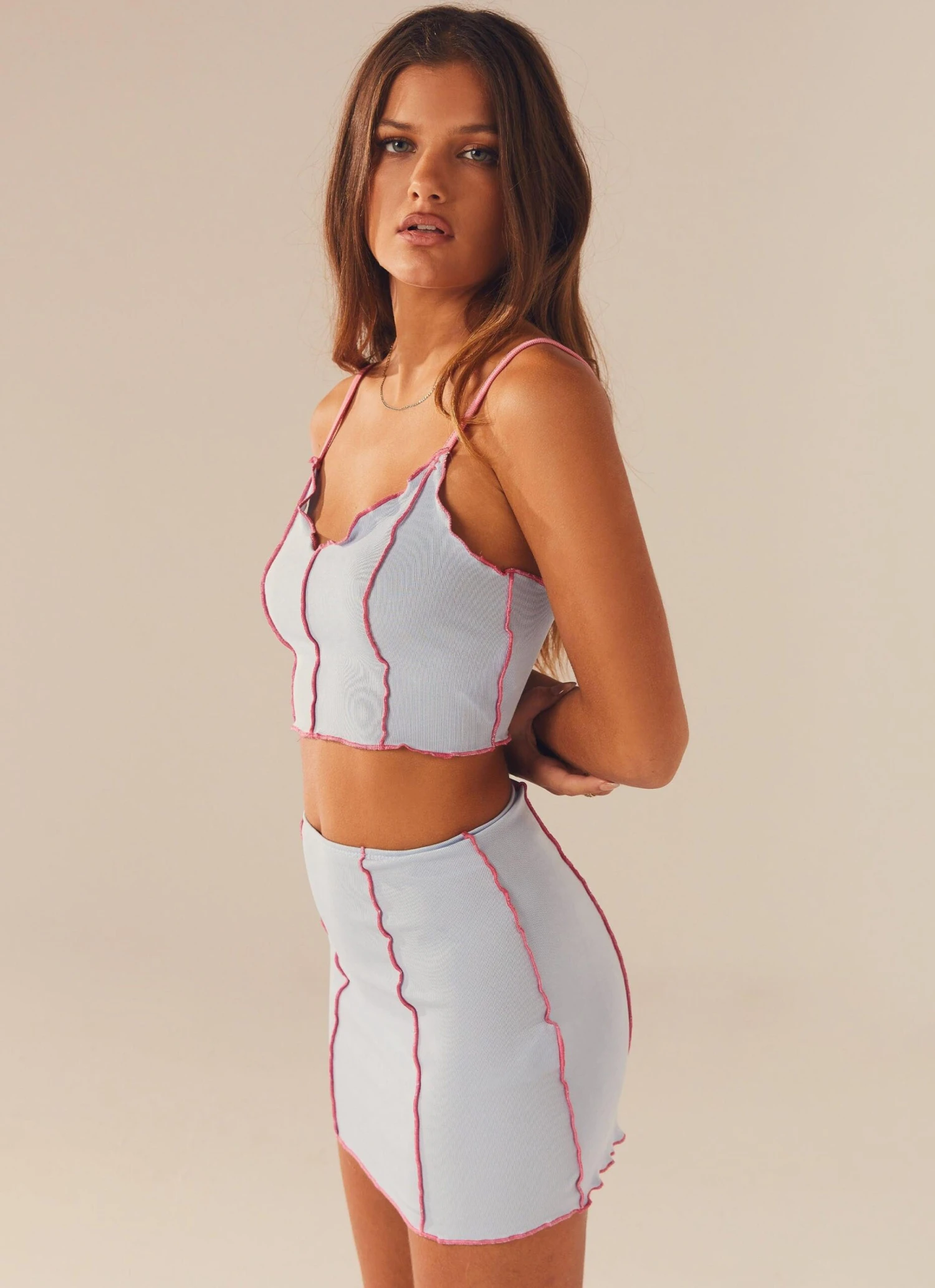 The cutest mini skirt! Our Sweet Lovin Mini Skirt is designed with pink stitching and cut in a slightly stretchy fabric. Pair with the matching Sweet Lovin Knit Cami Top for your next night out.