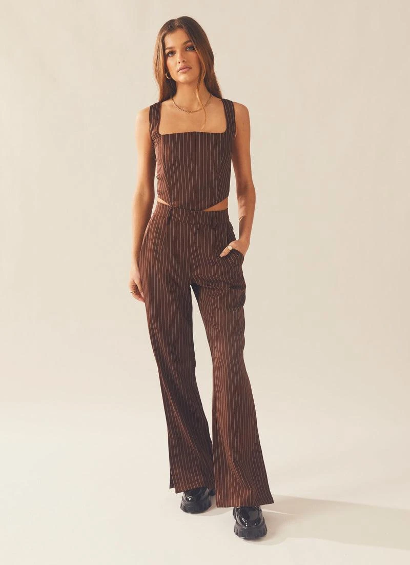 Handpicked for every it girl’s wardrobe! The Talula Pinstripe Bustier is a structured bustier in chocolate brown with pinstripe print and boning down the bodice and cut in a flattering soft v-shape. We love it layered with the Talula Pinstripe Blazer and Talula Pinstripe Pants.