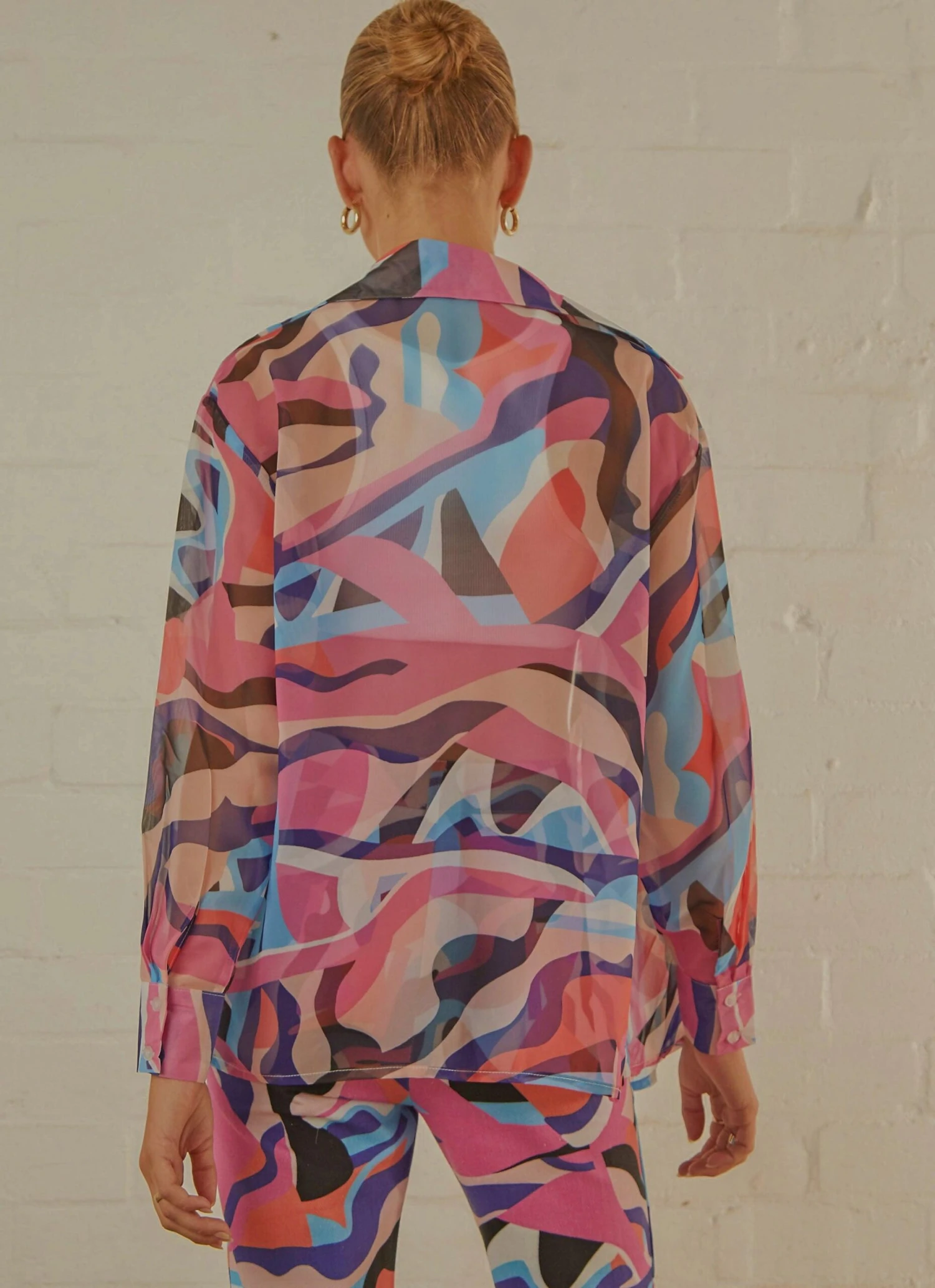 A fun spin on an essential wardrobe staple, the oversized shirt- Our Trippy Long Sleeve Sheer Shirt will make a colourful statement with your next denim and sneaker combo. We love this worn with a slouchy half tuck and gold jewellery. Pair with the matching Electric Avenue pants for the full vibe.